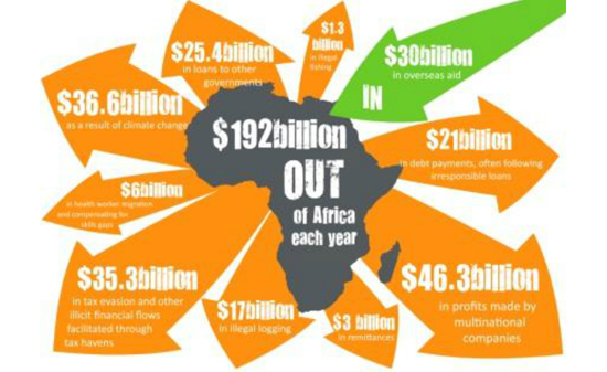 ‘While $134bn flows into the continent each year, predominantly in the form of loans, foreign investment and aid; $192bn is taken out, mainly in profits made by foreign companies, tax dodging and the costs of adapting to climate change. The result is that Africa suffers a net loss of $58bn a year.’