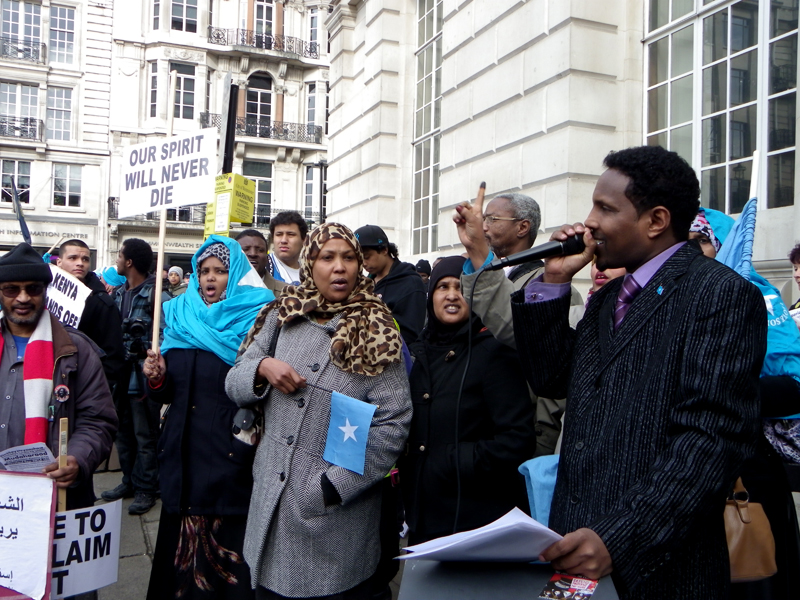 Hands Off Somalia! then came together with Voice 4 Somalia, a newly formed coalition of Somali activists in London, to build a united demonstration. We maintained a powerful presence outside the Conference with a mass of Somali flags and placards bearing anti-imperialist slogans and an open microphone which demonstrators put to constant use with speeches, slogans, songs and poetry in Somali and English.