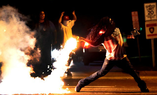 Once again the people of Ferguson have had to display their righteous anger in protest over the death of Michael Brown. This time it was provoked by the announcement that Brown’s killer, Officer Darren Wilson, would not face any indictment. This was compounded by Wilson’s remorse-free announcement that his conscience was clear. What feeling breathing person, faced with this injustice and contempt, could easily restrain themselves from venting their anger? The furious people of Ferguson burnt cars and businesses and fought the police. In response the ‘Civil Rights’ fire brigade showed up to pour cold water on the popular rebellion, to condemn rioting and insist that all protests be peaceful, ie ineffectual. But their efforts at collaboration were themselves ineffectual as justice-minded people across the United States and internationally protested against this travesty of justice. In California, roads were blocked for three consecutive nights and hundreds arrested as they marched through Oakland and Los Angeles.