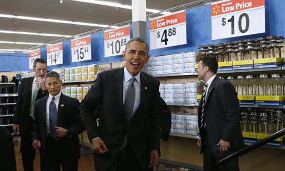 When Barack Obama was a candidate for President he said ‘I don’t mind standing up for workers and letting Walmart know they need to pay a decent wage and let folks organize.’ Yet on 9 May, visiting California on one of his regular fundraisers, Obama became the first sitting President ever to visit a Walmart store while in office, giving a speech on energy efficiency in the Walmart at Mountain View, and without saying a word about decent wages and the right to organize. Workers and their supporters protested this outrageous breach of elementary solidarity. Michelle Obama attended a Walmart business roundtable in March and has cheerfully embraced Walmart in her campaign against childhood obesity since 2011, appearing at Walmart stores and with Walmart executives at business functions.