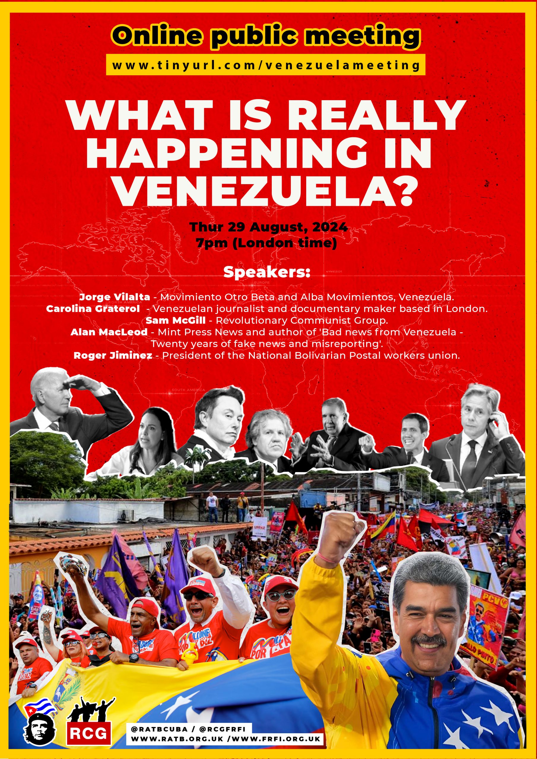 On 29 August, The Revolutionary Communist Group (RCG), through its campaign Rock Around the Blockade (RATB), held a public webinar on ‘What is really happening in Venezuela.’ When the Venezuelan Presidential elections on 28 July resulted in a victory for incumbent Nicholas Maduro of the Party , violent riots and media attacks ensued. This chaos was organised by the US backed opposition, Edmundo Gonzalez and Maria Corina Machado, who serve as imperialist puppets in order to foster instability in Venezuela through violent sanctions, media lies, and government backed coup attempts since the Bolivarian Revolution began in 1999.