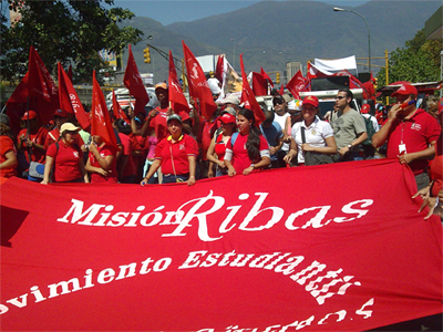However, more and more participants from the education projects of Mission Robinson and Mission Ribas are demanding to also be recognized as part of the student movement, adding to the tens of thousands Chavista university students prepared to defend their Bolivarian Revolution. (Mission Robinson teaches reading, writing and arithmetic to adults in local communities and Mission Ribas is a night school project providing high school level classes to Venezuelans who did not complete high school). Despite the fact that the overwhelming majority of students are supportive, the international private media gives an unprecedented amount of attention to the few hundreds of opposition students who participate in press stunt protests. There are hardly any mentions of the thousands strong marches of pro-Chavez students, if only to distort and underestimate the numbers participating in an attempt to prove a decline in support.
