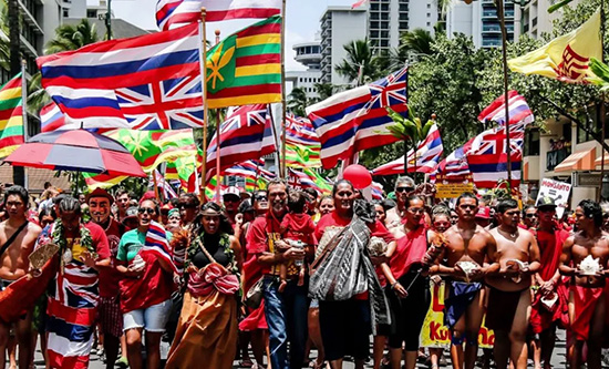 Hawaiʻi developed some of the world’s oldest universal social services such as universal healthcare, education, housing, and public transportation. In 1887, then-King Kalākaua was forced to sign the Constitution, known as the Bayonet Constitution, drafted by US businessmen and lawyers, stripping the King of much of his authority. In 1893 Hawaiʻi was finally seized by the US in collusion with settler compradors. The Hawai‘ian government was overthrown and Hawai‘i has been illegally occupied since the so-called ‘annexation’ of 1898. However, because no treaty of annexation was signed, due to the successful organising efforts of the indigenous Hawaiʻian people, the US instead arrogantly passed a joint resolution in its Congress, essentially a domestic law with shameless extraterritorial claims.