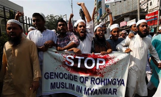 Hundreds of thousands of Rohingya have fled Myanmar; a majority to Bangladesh, others to Malaysia, India, Thailand, Saudi Arabia and Pakistan. Mines laid by the Myanmar army lie along the two main land crossings between Bangladesh and Myanmar and have caused numerous casualties. Bangladesh has continuously returned many of the Rohingya, and Prime Minister Sheikh Hasina recently called for ‘safe zones’ in Myanmar to keep returning them to, despite many of the refugees being orphaned children. Many are pushed back or detained at the border between the two states. Numerous Rohingya have drowned in surrounding seas whilst trying to access neighbouring shores on tiny, overcrowded boats. Recent monsoons across South Asia have been making it all the more dangerous for Rohingya refugees and even those fortunate enough to have survived so far face horrendous conditions at camps. Indian border forces have been using stun grenades containing chilli spray to deter Rohingya entering India. On 19 September Theresa May, responding to criticism of Britain’s complicity with genocide, promised to ‘stop all defence engagement and training of the Burmese Military’.