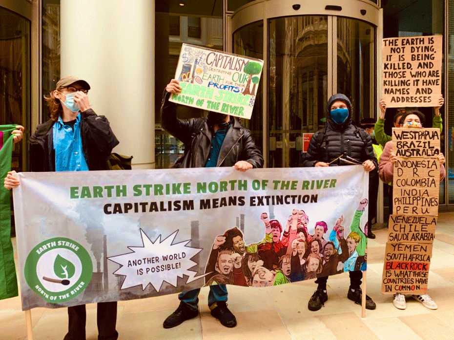 Despite a heavy-handed intervention by City of London police at the start of the protest and the high level of policing throughout the event, using the pretext of Coronavirus Regulations on gatherings, the protest was a huge success, with over 90 people participating in the two-hour event. There were loud chants and music, and speeches from the London Mining Network, XR, Bolivia Solidarity Campaign, Brazilian Women Against Fascism, a West Papuan comrade and the Revolutionary Communist Group, as well as all other Earth Strike groups. The speeches were impassioned and informative and, together with the colourful placards, flags and banners, we all learned all we need to understand about the imperialist plunder and devastation that Black Rock invests in.