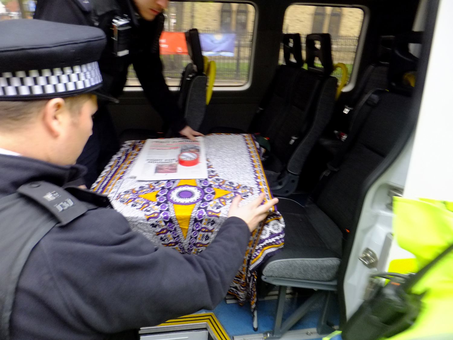 With 40 minutes left to go on our weekly stall John Oddie, a Newham Law Enforcement officer, accompanied by several police, approached the stall, in what was obviously a pre-planned operation. They demanded that we pack up immediately or else they would seize our table, banner and sound system, quoting the Environmental Protection Act 1990 (regarding the sound system) and the London Local Authorities and Transport for London Act 2003 (regarding the banner and table). However, they chose the wrong people to intimidate.