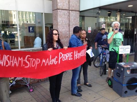 Supporters of south London Revolutionary Communist Group (RCG), People Before Profit (PBP), Focus E15, and supporters from various organisations including south-east London People’s Assembly and Left Unity gathered outside Lewisham Council offices today together with Sandra, a Catford resident who has been homeless since last year.