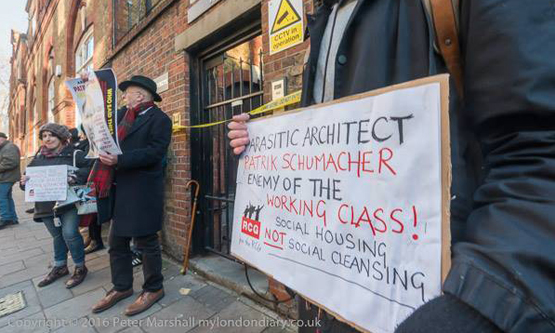 On Wednesday 30 November, the RCG were among the two dozen social housing activists who responded to the call by Class War to protest outside Zaha Hadid Architects practice in Clerkenwell against their anti-working class, neoliberal principal, Patrik Schumacher. In a recent presentation at the World Architecture Festival in Berlin Schumacher claimed that council house tenants in central London are ‘free-riding’ and should be shooed along to make way for his staff members or those that supposedly generate wealth. This is just one of the many poisonous ideas that seem to spew out of Schumacher’s mouth; he recently lavished praise on those who have second homes in London: ‘Even if they’re here only for a few weeks and throw some key parties, these are amazing multiplying events.’ It seems astonishing that one of the leading voices in contemporary architecture can be saying that someone staying for only a few weeks is more entitled to a second home than one of the thousands of Londoners that don’t even have a roof over their heads in the first place.