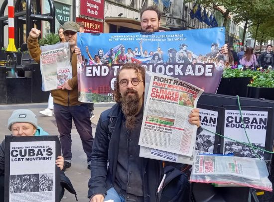 Birmingham RCG and our Fight Racism! Fight Imperialism! supporter’s group held a rolling picket in solidarity with socialist Cuba on Saturday the 30th of October. After weeks of discussion meetings based around our pamphlet, Revolutionary Cuba, the streets are ours we protested outside of various locations around Birmingham. Targeting the institutions of British imperialism that comply with the blockade. There we upheld all that the Cuban people have managed to achieve, despite US economic warfare.