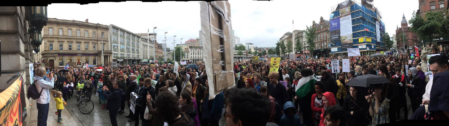 On 28 June RCG supporters joined more than a thousand people at a demonstration called by Nottingham People’s Assembly under the banner ‘Nottingham Together’. Nottingham RCG took the opportunity to raise the issue of the 2016 Immigration Act, taking a petition round the crowd that was very well received. We also organised parachute games for children to make it easier for their parents and carers to participate.