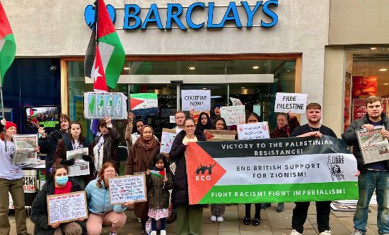 Fight Racism! Fight Imperialism! will always highlight this to build a movement in Britain for Palestine that can sever British state support for Zionism. The two FRFI supporters did so on 14 October, pointing out, as participants in a spontaneous march, the huge investments Barclays bank holds in the Israeli occupation, including over £1bn of investments in Israeli arms companies which sell weapons that are ‘battle-tested’ on the Palestinians. The FRFI supporters pointed out that Barclays is among several British high street banks which are crucial tools in sustaining the profits of British imperialism, and therefore are instrumental in maintaining British support for the occupation of Palestine, which exists to defend British imperialist interests in the Middle East.