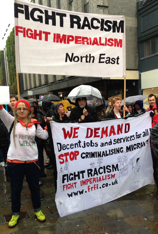 Following the march an FRFI supporter attended an open meeting called by Newcastle City Council to plan Newcastle’s response to the ‘Syrian refugee crisis’. The council has promised to house ten Syrian families – a drop in the ocean relative to the numbers forced to flee their homes. The FRFI supporter challenged council leader Nick Forbes on what would be done to ensure these families are welcomed into the community, citing the experience of families housed under the government’s asylum dispersal programme in previously boarded-up houses, many of whom were isolated and subject to racist abuse. Forbes stated that the council will be making provisions to ensure there is adequate support for the families and to get local residents on board. The supporter also called on Forbes to commit to make a statement opposing immigration raids on work places, given he has designated Newcastle a ‘city of sanctuary’. Forbes said that he would discuss this with deputy leader of the council Joyce Mccarthy, and that he wanted everyone to have access to decent work and services. FRFI will be following these promises up.