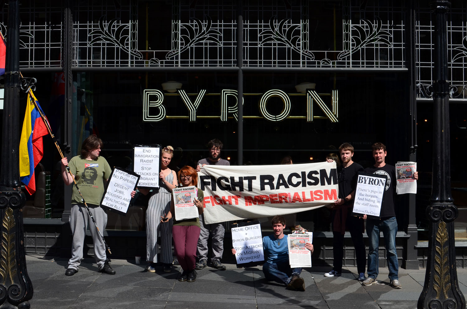 On Saturday 6th August supporters of Fight Racism! Fight Imperialism! North East held a picket of the Byron Burgers restaurant in Newcastle. The picket was against the recent immigration raids, which Byron and the Home Office orchestrated, when Byron workers were pounced upon by immigration police in a phoney health and safety meeting called by Byron, and subsequently 35 workers have been arrested and deported.