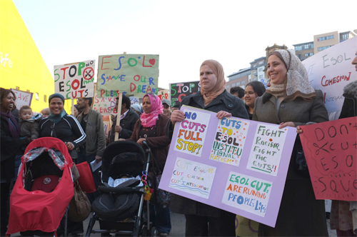 On Thursday 24th March Tyneside Community Action Against Racism led a march against cuts to English lessons for speakers of other languages (ESOL). Around 200 people marched through the city centre to Grey’s Monument for a rally, where people who depend on ESOL fearlessly got up to speak to defend their right to education. It was a lively action, lots of banners, placards and chanting “They say integration! We say education!” Newcastle College and the Angelou Centre helped to mobilise ESOL students and lecturers and people generally against the cuts to come out to defend ESOL provision. The message was clear: we need to fight against all cuts and cuts to ESOL represent institutional racism aimed at dividing the fight back.