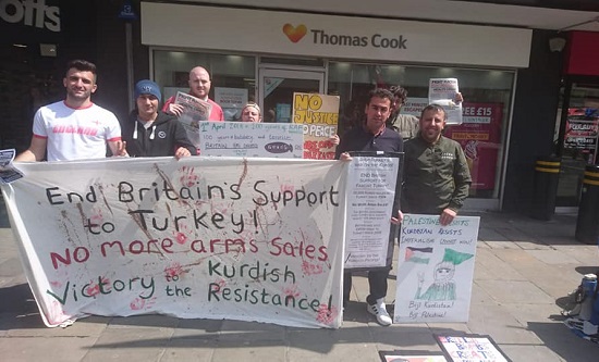 Saturday 26 May was called as a day of solidarity for the Kurdish city of Afrin, Syria in opposition to the invasion by the racist state of Turkey. We held a demonstration outside the Newcastle branch of Thomas Cook on Northumberland Street. Thomas Cook sell holidays to Turkey and guided tours of Israel. The Kurdish and Palestinian people call for boycotts of holidays in Turkey and Israel in order to financially isolate their oppressors, calls which FRFI supports. In addition to these deals however one of Thomas Cook’s directors, Warren Tucker also sits on the board of the government’s Foreign and Commonwealth Office (FCO) and is Chair of the FCO’s Audit and Risk Committee. On the day we were joined by a number of FRFI supporters as well as a group of Kurdish people. We informed many members of the passing public and those going into Thomas Cook of the atrocities committed by Israel and Turkey. We convinced people to not holiday in Turkey.
