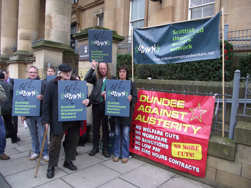 Dundee Fight Racism! Fight Imperialism! and Dundee Against Austerity activists turned out for the recent court appearances of Tony Cox. A member of the Scottish Unemployed Workers Network, Tony has faced a number of charges over the year for his welfare advocacy work. In early 2015 he was arrested at the Job Centre in Arbroath as he tried to accompany a vulnerable person into an interview. Statistics and campaigning experience have shown that welfare sanctions – where a person’s entitlement to Job Seekers Allowance or Employment Support Allowance can be ended or reduced to 40% – are disproportionately imposed on people with mental health or learning difficulties.