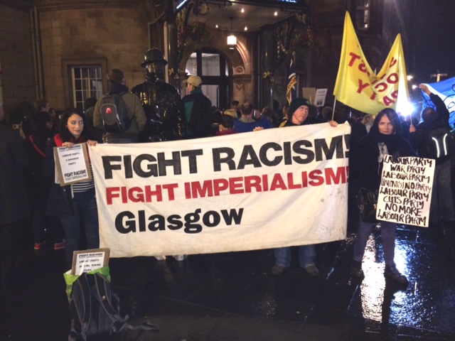 On 30 October in Glasgow city centre Fight Racism! Fight Imperialism! comrades joined with other supporters of Scottish Independence to hasten this awakening against the Scottish Labour Party. Hundreds gathered and joined the protest outside the Party’s National Gala Dinner in rejection of the Labour Party’s racist, imperialist, anti-democratic, anti-working class, British unionist politics. A Party Fit For Imperialism! One could sense the fury and nervousness of leading Labour party war criminals such as Jim Murphy as they passed into the building under police escort – heckled, physically hassled and booed. Disgraced head of Glasgow city council Gordon Matheson was forced to slip in through a side entrance.