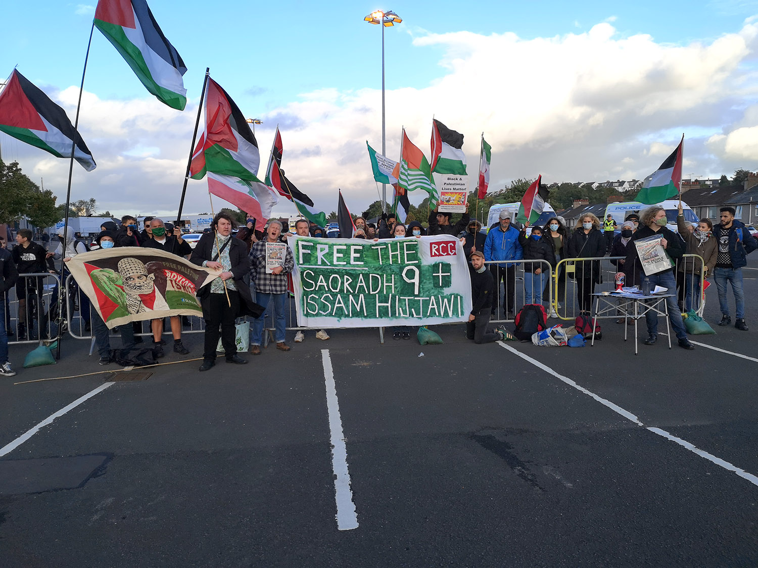 At the protest we held an open mic which was taken up by many speakers to lead chants and to condemn the complicity of British imperialism in the ongoing occupation of Palestine. The Scottish Government and Glasgow City Council adoption of the IHRA definition of anti-Semitism, which deliberately conflates anti-Zionism with anti-Semitism, was condemned. We called out the hypocrisy of the Scottish Football Association which claims to oppose racism while giving tacit support to Israeli settler colonialism, ignoring the call from Palestinian footballers to boycott Israel in protest at their treatment. The protest also gave solidarity to Irish and Palestinian political prisoners and demanded the release of the Saoradh 9 and Dr Issam Hijjawi (see here) in Ireland.