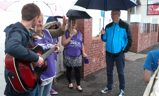 In both cities we encouraged unity between the strikers and the unemployed by publicising and inviting all to attend strikers’ pickets and our weekly and monthly pickets outside the Wellgate and Govan jobcentres. We appealed on the basis that an injury to one is an injury to all.
