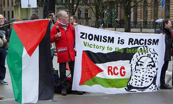 The ZIR protest was also joined by a contingent of Young Communist League (YCL) activists, and many other anti-racists from across Scotland including two Palestinian women who took up the open mic to encourage us all to keep protesting. A contingent from the Fire Brigades Union joined ZIR’s counter protest. An FBU speaker later highlighted from the SUTR platform the racism facing the people of Palestine. However, while statements of solidarity for Palestine were heard from the SUTR platform no opposition to the accommodation of Zionists on the SUTR march was expressed. To anti-Zionists in the square, the silence was deafening! As in previous years the Scottish Palestine Solidarity Campaign (SPSC), and its affiliate organisations, boycotted the SUTR march but did not support or join ZIR’s counter protest.
