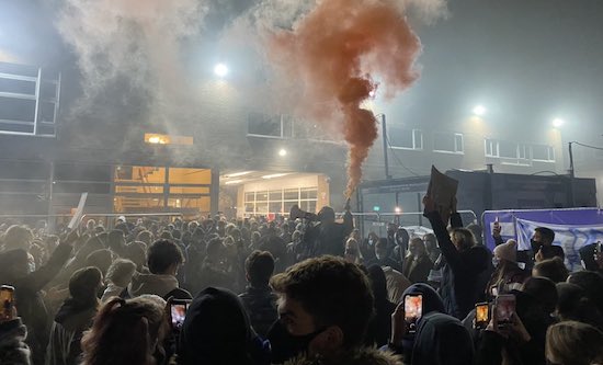 The response of UoM was to spend £11,000 to put fences around the Fallowfield student accommodation on 5 November, when new ‘lockdown’ measures came into effect in England. Students were not warned that they were about to be fenced in. Swipe card access to buildings was restricted and exits were blocked, and all those going in or out of the campus had to produce ID. This was the last straw, and hundreds of protesting students tore down the seven-foot fencing the same day it was put up. UoM agreed to remove the fencing, but increased security presence on campus. Students continued to organise protests, calling for Vice-Chancellor Dame Nancy Rothwell (basic salary in 2019 £269,000) to step down over the university’s handling of the pandemic, and after security staff racially profiled a black first year student, pinned him up against a wall and demanded to see his ID because he ‘looked like a drug dealer’.