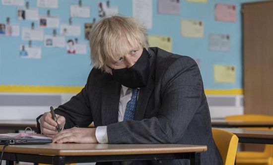 Prime Minister Boris Johnson sits in a school classroom wearing a face mask