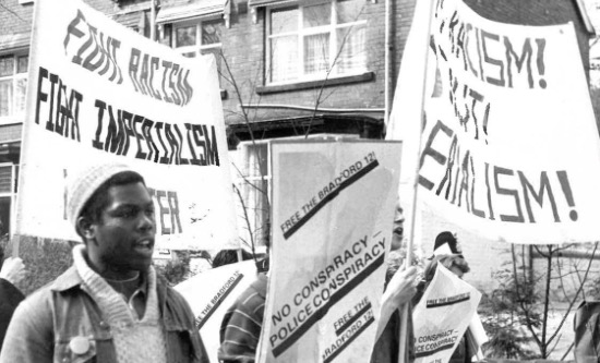 That the British state had a better understanding of the threat from black organisation became evident when it launched a determined attack on Asian youth organisations in Bradford. On 28 July 1981, following the discovery of a small cache of petrol bombs in the Manningham area of Bradford, police arrested 13 people of whom 12 were to be charged. The petrol bombs had been assembled nearly three weeks earlier by members of the United Black Youth League, a split from AYM-B, because of a threatened attack by the racist National Front. Charged with conspiracy and therefore facing possible life sentences if guilty, the Bradford 12 decided to go on the offensive. First, they successfully challenged the state’s selection of an all-white jury panel; the final jury was made up of Asian, Black and white working class people. Second, rather than deny responsibility for the petrol bombs, they asserted that their actions were justified by the need to protect their community given a long history of police inaction against previous attacks. The slogan ‘self-defence is no offence’ of the Bradford 12 Defence Campaign enabled it to mobilise widespread support; 500 demonstrated outside the court in Bradford on the first day of the trial in April 1982. The determination to get a jury of real peers paid off when it agreed that self-defence was indeed no offence and acquitted the 12 on all charges.