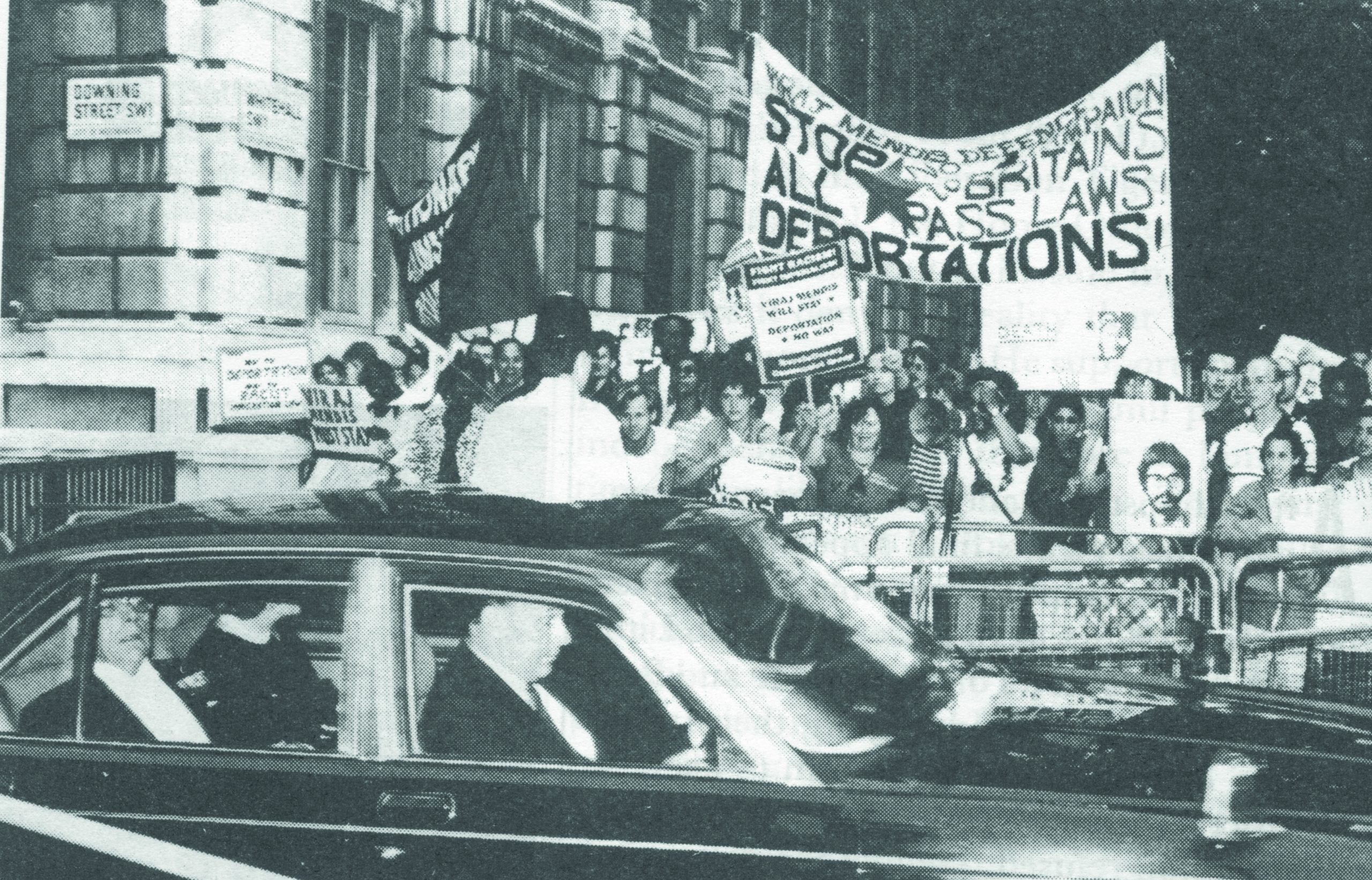 In July 1986 as part of our efforts to make the VMDC a national campaign, we organised a march from Manchester to the Home Office in London on the basis of ‘Viraj Mendis Must Stay – Fight the Immigration Laws’. In towns and cities the march passed through, local groups and campaigns held public meetings and arranged food and accommodation. From the beginning to the end of the march it faced constant harassment from the police, who attempted to limit its impact and actually stop it from marching. They failed, and the march was a significant factor in making the VMDC into a national campaign.