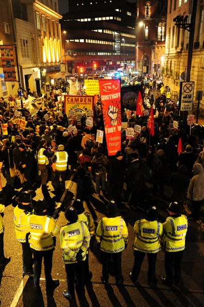 On arrival at Camden Town Hall we were told that no one could go into the public gallery. This was challenged but the police stopped any attempt at entry. After half an hour about 200 moved into Euston Road and stayed there for nearly an hour with the demand that the public be allowed in to the Council Chamber. The police were passive. The next day the Evening Standard reported that demonstrators had stopped an ambulance from getting through. This is untrue; a passage was cleared to chants of ‘We love the NHS – no to privatisation’. Local youths spoke on the megaphone about need to keep open youth clubs. Then news came that the public were being admitted to the town hall in small groups – a victory of sorts. Reports of the protest appeared on Local News television.