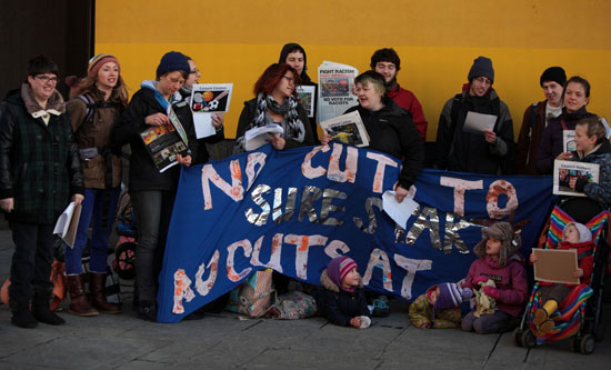 Having attempted to visit Council Leader Nick Forbes at his surgery in October (he didn’t turn up), on 12 December Parents Against Cuts organised a protest at a Northern Correspondent magazine event where Forbes was speaking. Campaigners marched in to the £10 ticketed event chanting and with banners unfurled and demanded answers from Forbes. The campaigners’ unwillingness to back down, despite threats of police involvement, resulted in the compère handing the protesters the microphone (see video at http://tinyurl.com/n-corres). Forbes responded by promising to release information, but failed to follow through. This was followed by a protest on 20 December in Newcastle Central Station’s lavish new glass foyer (which the council says is intended to attract business to the city). Protesters sang anti-cuts versions of popular Christmas songs while one dressed as Father Christmas mobilised the children to chase down ‘Nicholas Scrooge’ and force him to give the city’s services back (hear the songs set to images from our protests at http://tinyurl.com/xmas-protest).