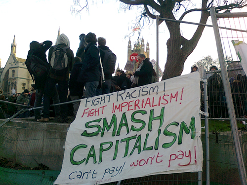 Throughout the afternoon, thousands of youth enjoyed a festival of defiance. There were fires to keep warm, music to dance to, hot teas and food distributed and metal barriers were used to set up toilets. When mounted police began charging and swinging batons into crowds of teenagers and young people waiting to leave the area, the youth acted with good proletarian instincts: blocking the horses’ path with the metal barriers. A healthy disrespect was shown for the paraphernalia of imperialist conquest which adorns Parliament square. The statues of Churchill and his ilk were decorated with placards and political slogans. Others used their sound systems blasting ‘conscious hip hop’ and the crowds of defiant dancers around them to hold back police onslaughts. There was a strong sense of solidarity and unity, as youth worked together to counter-attack tooled up police – the bodies of armed men who protect the capitalist state.