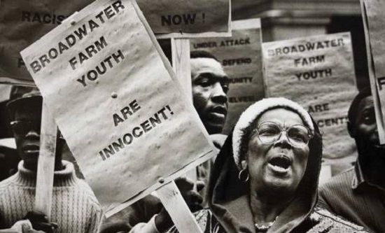 The death of Cynthia Jarrett, a local black mother who died after a brutal police incursion into her home, triggered an uprising against police harassment in October 1985. Protest raged in the community and the uprising led to the killling of PC Blakelock on the estate. The punishment of the entire community was long and savage. Doors were smashed in, property destroyed, over 300 residents, including children, were arrested and three innocent people were falsely convicted of murder in a climate of racist bigotry. These circumstances, especially the treatment of Winston Silcott, were later to be the subject of an Amnesty International Report. The fatal shooting of Mark Duggan – who grew up on Broadwater Farm – on 5 August 2011 was similarly followed by protests and rioting that spread to towns and cities all over the country for two days and nights. Potential confrontation between a racist police force and local young people continues to be a threat on the estate and in the area.