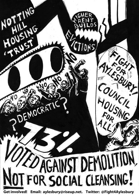 At the beginning of May, both the council and Notting Hill Housing Trust, the housing association masterminding the redevelopment of the estate, found themselves under pressure at the Public Inquiry into the Aylesbury Compulsory Purchase Order. The event was held in the Millwall football grounds, as organisers had feared it would be disrupted by protests if held nearer the estate. Leaseholders – who have been offered derisory sums of between £57,000 and £120,000 for their flats – were joined by tenants, architects, public housing experts, the 35% housing campaign and lawyers as they put the landlords on the spot.