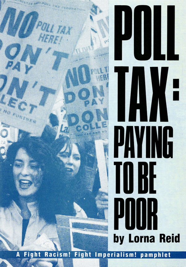 The Poll Tax replaces the rates system. The Tories politely call it ‘A community charge on property’. In fact it is a tax on people. Everyone over the age of 18 is required to pay. There will only be a few exceptions. This tax shifts the burden of local government finances on to the poor in inner city areas. It is a direct attack on the working class, especially working class families, low-paid workers, claimants and black people. Couples, assessed on their joint income, will each receive a bill which may have no direct relation to their individual income. Claimants will receive an 80 per cent rebate on the national average of £278 and not on the actual Poll Tax they have to pay. Pensioners not in receipt of benefit are required to pay the full amount. As well as imposing untold hardship, the Poll Tax will also disenfranchise sections of the poor. The Poll, Tax register will be compiled from the electoral register. The poor, in attempting to avoid payment, will not register to vote.
