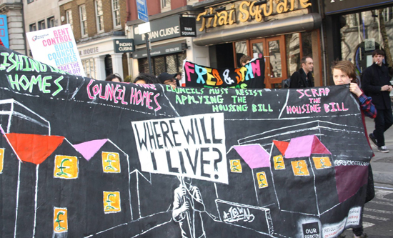 The banner here was made by Andrew Cooper with young people in Brixton from threatened housing estates for a youth housing march from the centre of Brixton to Cressigham Gardens (threatened with demolition) with the RCG and the rapper Potent Whisper.