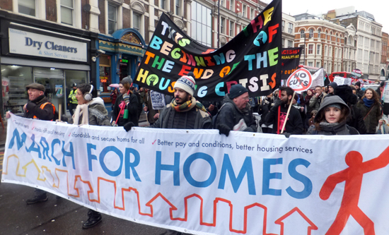 On 17 March, around 2,300 people gathered in central London to hear Britain’s politicians address an event styling itself the ‘biggest-ever rally for social housing’ in the country. In reality, it was nothing of the sort – not simply because the organisers, Homes for Britain, deliberately ignored the 5,000-strong March for Homes at the end of January, but because it had nothing to do with social housing. Homes for Britain is a coalition of housing associations, private landlords, builders and other housing professionals; like the pledges made by politicians with an eye on the general election to ‘end the housing crisis within a generation’, the whole charade was as full of hot air as the house-shaped balloon floated above Parliament Hill. The event was not about ending the housing crisis, but about managing it. Under pressure from real grassroots campaigns emerging in working class communities that are fighting to save council housing and challenging the diktats of the profit-driven housing bonanza, the Homes for Britain rally was an attempt to both sideline and stifle any real movement for change. Cat Alison reports.