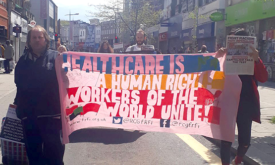 The coronavirus crisis has thrown up huge issues that overwhelmingly affect the working class in Britain. Anger over the appalling lack of Personal Protective Equipment for workers in hospitals and care homes surfaced early on during the lockdown. Official data showed clearly that the poorest sections of the working class – and in particular those from black and minority ethnic backgrounds – were being disproportionately affected by Covid-19. Most recently, we have seen the government shamelessly prioritise the needs of a profit-generating economy over the health of the working class. Throughout, the Revolutionary Communist Group has continued to go out on the streets – safely, socially distanced and absolutely legitimately even under emergency lockdown legislation – to ensure that we could offer a political alternative to the incompetence, callousness and greed of a failing capitalist system. We have held stalls in working class areas in London, Nottingham, Birmingham, Liverpool and Manchester; organised regular protests outside King’s College Hospital in south London and the Whittington in north London to coincide with the weekly ‘Clap for the NHS’ to demand PPE and decent pay for health workers, and marked International Workers’ Day with a socially distanced protest in solidarity with frontline workers. We have spoken to people outside hospitals, queuing at supermarkets and working at bus depots about their fear and growing anger at the way the government has handled the crisis.
