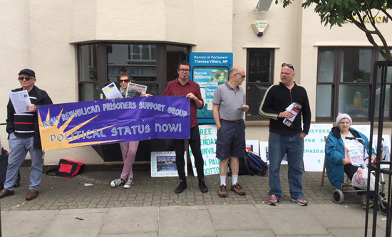 On 2 July FRFI supporters joined a protest calling for Tony Taylor’s release at Theresa Villiers’ London surgery. We urge supporters to keep the pressure up by writing in protest to Villiers’ replacement, James Brokenshire, at the Northern Ireland Office, 1 Horse Guards Road, London SW1A 2HQ.