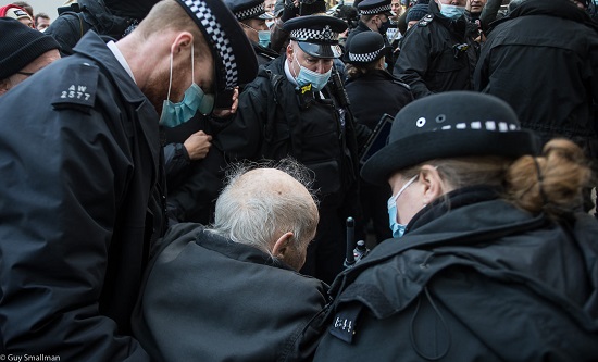 Main article image: Police forcibly dispersed Assange’s supporters, including 92-year-old Eric Levy, who were protesting outside the bail hearing on 6 January. (Photo: Guy Smallman)
