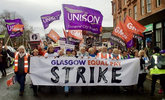 The dispute dates back to 2006, when Glasgow City Council was run by the Labour Party. With the active collusion of the GMB and Unison unions, it introduced a pay review that was totally discriminatory. The union acted to ensure that the bonuses of male workers were protected at the expense of women in similar jobs; women were pressurised by the Labour council and the union to sign on the dotted line, many unaware that they would be up to £4,000 a year worse off than their male counterparts. The Labour council fought the ensuing claims of more than 12,000 women all the way to the highest court in Scotland. The trade unions have acted as an adjunct of the Labour Party and resisted taking any action towards a just settlement. It is telling that only about a third of the women are represented by the union in fighting their equal pay claim.