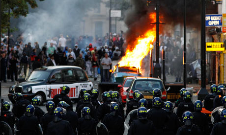I asked some more people why they were there. An Irish guy in his late 20s said: ‘It’s obvious init? Have you seen what the cops can do to people?’ This was a recurring theme, with another man shouting later on: ‘You police think you can just come around and bully us, but now we’re fighting back!’ A young man standing next to a burning car told me he was out because of the cuts and police killing innocent people.