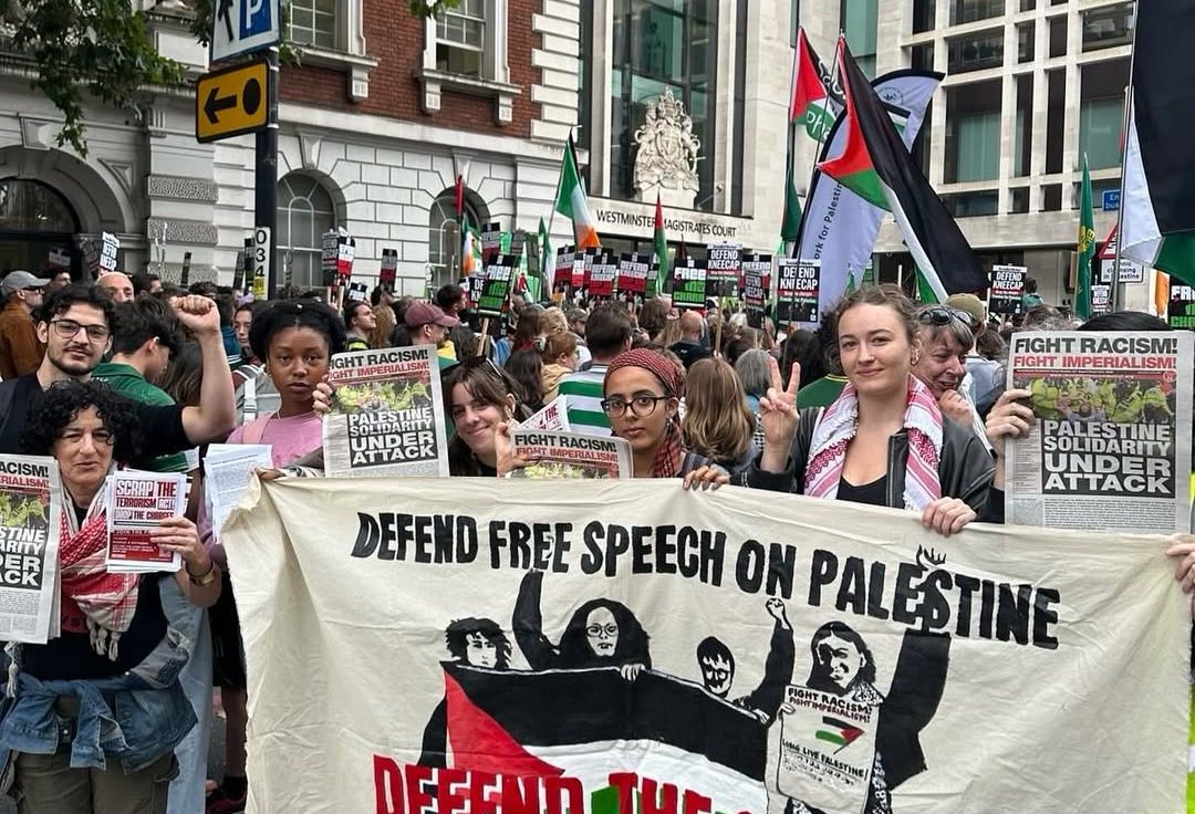 Liam Óg Ó hAnnaidh, known as Mo Chara, one of the members of Kneecap, is in the crosshairs of the British state, with charges levied against him under the Terrorism Act for allegedly holding a Hezbollah flag at a gig in 2024. He has been released on unconditional bail. Comrades of FRFI joined hundreds who protested outside Mo Chara’s first hearing at Westminster Magistrates Court on 18 June. The outpouring of solidarity with Kneecap has ensured that the band has not been isolated in its struggle against a Zionist smear campaign and trumped up charges.