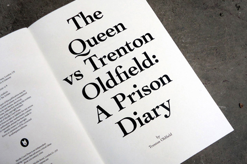 The Queen vs Trenton Oldfield chronicles the period the author spent in Wormwood Scrubs in the form of an observational day-by-day diary, interspersed with comment and analysis of his unfolding experience. It also contains transcripts of his trial and of an in-depth interview by Voice of Russia with his partner Deepa Naik, alongside various articles written on his case and a ‘Visual Diary’ comprising colour photos of prison issue items from clothes to tobacco and reproductions of documents which relate either to his individual imprisonment or to procedures in place at Wormwood Scrubs. Most notable amongst the latter is a Notice to Prisoners on ‘Racist offensive material’, which contains a list of ‘Prohibited Organisations and Publications’, beginning: ‘Black Panthers, Ku Klux Klan, White Wolves, UDA/IRA, British National Party…’