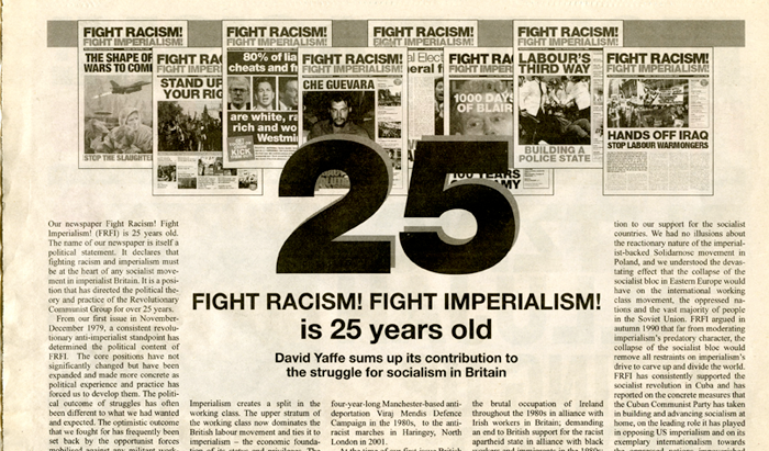 Our newspaper Fight Racism! Fight Imperialism! (FRFI) is 25 years old. The name of our newspaper is itself a political statement. It declares that fighting racism and imperialism must be at the heart of any socialist movement in imperialist Britain. It is a position that has directed the political theory and practice of the Revolutionary Communist Group for over 25 years.