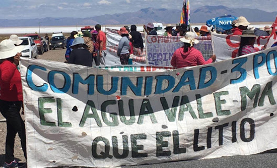 The environmental impacts of lithium mining are huge. In the lithium triangle salt flats – Bolivia’s Salar de Uyuni, Chile’s Salar de Atacama, and Argentina’s Salar de Arizaro – extraction is carried out by drilling deep holes to remove vast quantities of brine which is then concentrated to produce lithium carbonate. This uses 500,000 gallons of water per tonne of lithium in one of the driest places on earth. This massive consumption of water has drastically lowered the water table, disrupting the water supplies upon which local indigenous communities depend. Once the brine has been extracted, it is left in vast pools to evaporate for months, leaving concentrations of manganese, potassium, borax and lithium salts. Waste pools of bright blue water, and heaps of toxic salts are left behind, polluting the soil and the air. Water has been frequently contaminated by chemical leakage from the mines – often hydrochloric acid. In Chile this has led to conflict over water between the mining companies and the Toconao community. Throughout the lithium triangle the environmental impacts are compounded by other mining activity, including for zinc, silver and copper.