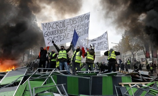 On the other hand, the movement also involves many progressive political tendencies. Slogans on the t-shirts of protestors, or daubed in graffiti, include condemnations of racist police violence, the observation that ‘climate change is war on the poor’ or the slogan ‘down with imperialism!’. The demands of the Parisian university protestors include the prevention of the increase of fees for foreign students. Prominent far-right figures have been attacked by leftists on the streets of Paris.