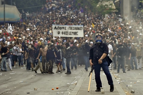 On May Day, over 30,000 people took to the streets of Athens bringing traffic and trade to a standstill. Demonstrators focused their anger on the Finance Ministry Building where violent clashes took place with the police. Protestors chanted anti-EU and IMF slogans such ‘We do not step back! We do not consent! The social class will take to the streets!’ Huge demonstrations also took place in Thessaloniki, Greece’s second city, where Molotov cocktails and stones were thrown at riot police who were protecting the banks.