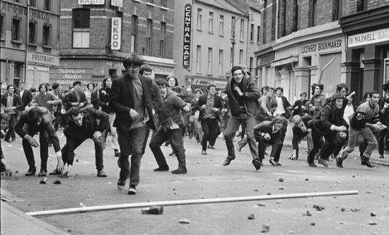Later, there was fighting at the edges of the Bogside – a staunch nationalist area of Derry – which lasted until the early morning. Police cars were stoned, shop windows smashed, petrol bombs thrown, and barricades were erected.
