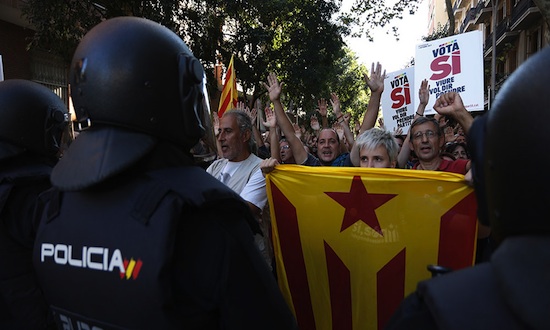 As the Catalan government refused to call off the referendum, the Home Office announced it would control polling booths and arrest any organisers who turned up. Regional police have been relieved of their authority and the whole operation has been centralised under the command of Colonel Diego Pérez de los Cobos – an army officer sentenced in 1999 for leading a group of civil guards who tortured a Basque activist and pardoned that same year by President José Maria Aznar. On 26 September new convoys departed from Spanish police stations and barracks, carrying personnel and materiel, including armoured water tanks. It has emerged that 75% of Spain’s riot police have been stationed in Catalonia, together with 10,000 Civil Guards, something not seen in the last 40 years. On 27 September, a military detachment was deployed to Valencia, to prepare for possible action during or after the 1 October vote. It is clear the Spanish state is ready to completely militarise Catalonia and launch full-scale repression on its population. It seems unlikely that they can close all 6,000 schools where voting is due to take place by force but they may try to establish militarised perimeters to prevent queues of voters being visible to the world’s media. If they do try to prevent people from voting, there is bound to be resistance.