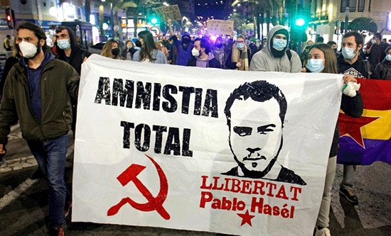 Pablo Hasel, from Lleida in Catalonia, was sentenced to nine months in prison, six years disqualification from working in the public sector and a €30,000 (£25,910) fine. Rather than turn himself in, he tried to build support for the struggle against censorship. On 15 February, he locked himself into the University of Lleida with some of his supporters. The following day riot police burst into the building and took him to prison, where fresh charges were brought against him relating to his defence of Catalonia’s political prisoners. For almost 10 years, Pablo Hasel has been regularly harassed by the police, arrested and brought to court. The Spanish state is clearly intent on making an example of him because of his uncompromising communist stance.